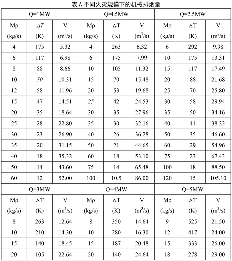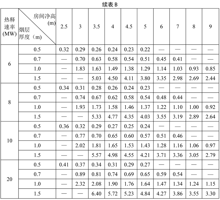 注:1 本表仅适用于排烟口设置于建筑空间顶部,且排烟口中心点至最近墙体的距离大于或等于2倍排烟口当量直径的情形。当小于2倍或排烟口设于侧墙时,应按表中的最大允许排烟量减半。